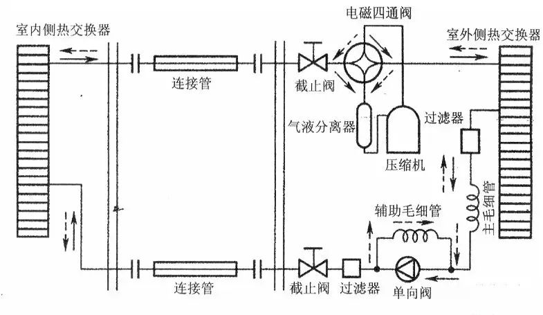 3、 熱泵系統(tǒng) 。與單冷系統(tǒng)情況相同,熱泵運行是否正常,主要檢查四通換向閥的工作情況。換向閥換向時,可聽到有比較響的氣體流動聲以及電磁閥頂針的撞擊聲(電磁場吸動閥心),當電磁閥在換向過程中聽不到上述兩種聲音,那電磁閥可能出故障。