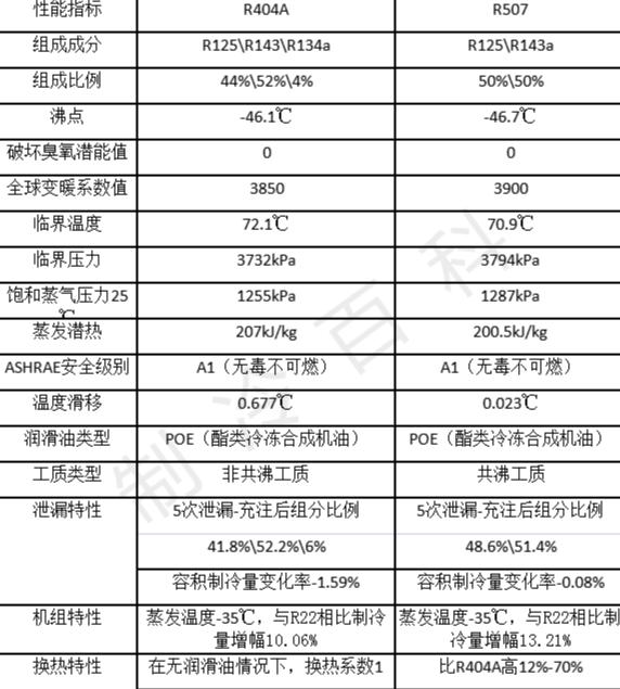 2、R404a與R507的壓力溫壓表上的數據表明,二者之間的壓力幾乎相同,,如果大家平時留意下用的系統配件,會發現熱力膨脹閥上的標示說明是R404a與R507共用的。