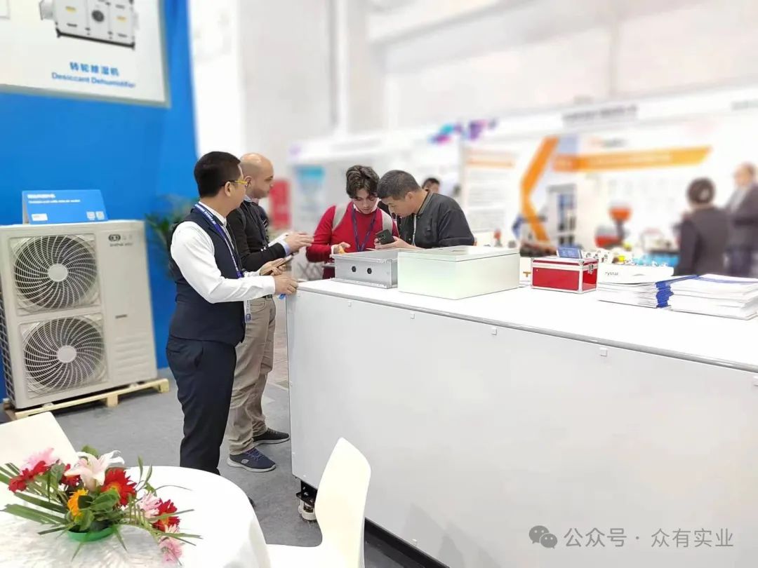 本次展覽中,眾有實業展示了多款創新產品,包括工業除濕機、機房精密空調機組、凈化型直膨式變頻恒溫恒濕機組以及恒濕機(除濕加濕一體機),充分展現了公司在制冷領域的強大研發實力和創新能力。